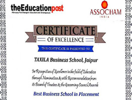 ASSOCHAM awarded Taxila Business School as 'BEST PLACEMENT CAMPUS 2020' in APETA summit 2020 (Asia Pacific Education and Technology Awards)..