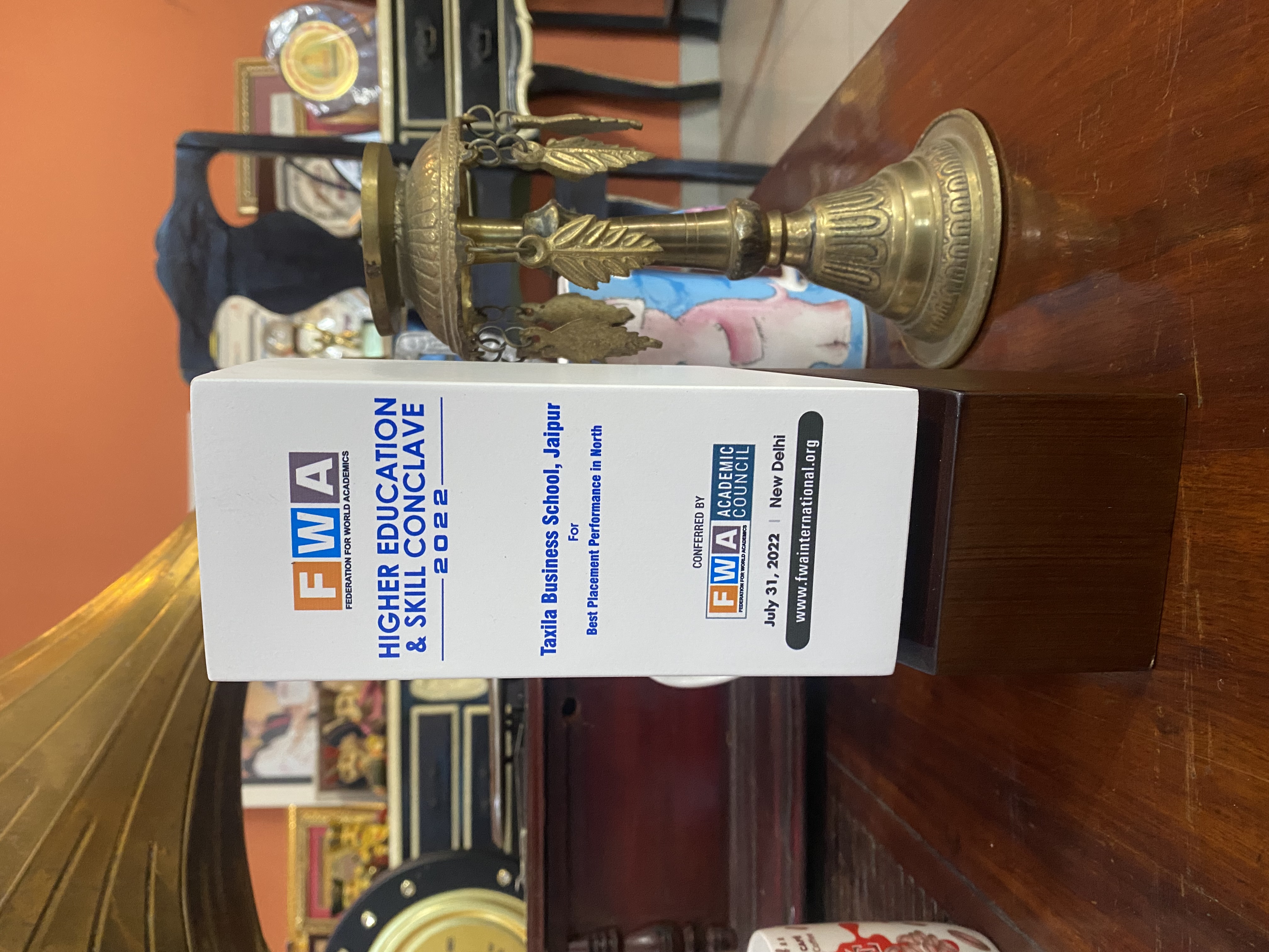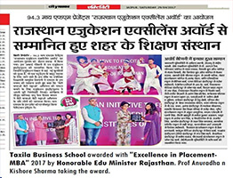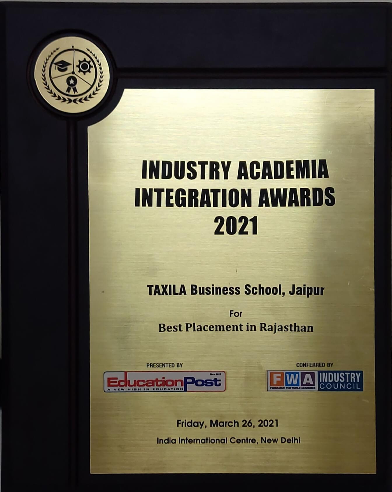 Taxila Business School Received Industry Academia Integration Award 2021 for Best Placement in Rajasthan Presented By :Education Post Conferred By :Federation for World Academics(FWA).