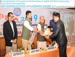 Shri Bhupendrasinh M Chudasama, Hon’ble Minister for Higher and Technical Education, Gujrat Government presenting: BEST BUSINESS SCHOOL IN PLACEMENT AWARD 2019 to Taxila Business School.