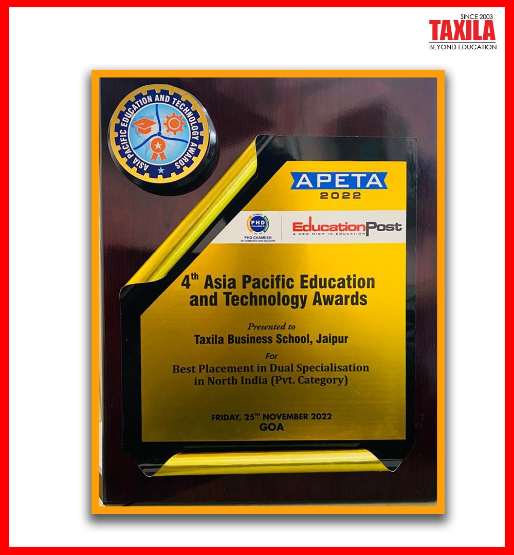 4th Asia Pacific Education and Technology Awards (APETA 2022) presented to Taxila Business School for the Best Placements in Dual Specialization in North India..